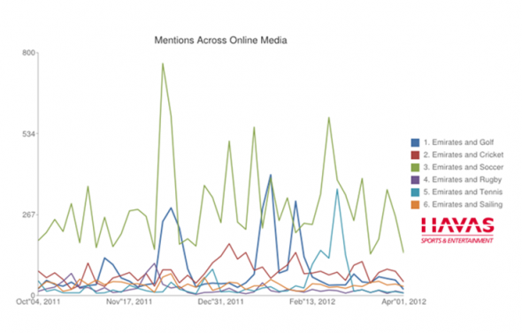 Grâce à un outil très compliqué mis au point par Havas Sports & Entertainment, il est possible de mesurer le nombre de mentions, par jour et sur 6 mois, faites sur tous types de supports digitaux (sites, blogs, réseaux sociaux) concernant Emirates et ses partenariats.