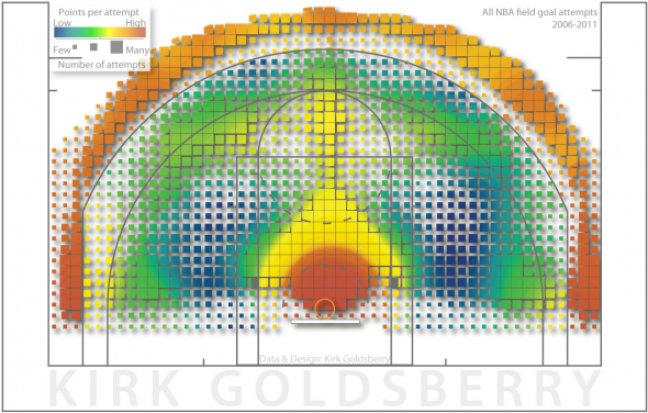 Cette infographie (plutôt moche) compilent l’ensemble des shoots pris entre les saisons 2006 et 2011. Plus la couleur est chaude, plus l’adresse est au rendez-vous. La taille du carré indique la quantité de tirs réalisés. Plus ce carré est grand plus les joueurs ont tenté leur chance dans cette zone. Un conseil donc, entrainez-vous dès maintenant aux 3 points dans le corner car c’est là que vous serez le plus utile sauf si vous faites 2m15, vous serez la tour de contrôle qui marque dans la raquette.