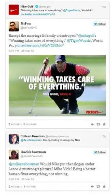 « La victoire prend soin de tout » n’est passé chez tous les fans de Nike. Certains ont évoqué le mariage ruiné du champion ou même la récente affaire Armstrong. L’équipementier nous a habitué à apporter un soutien inconditionnel à ses champions dans la difficulté mais ici la réjouissance s’est heurté quelque peu au passé tout frais de Tigre. On connait tous la sensibilité des américains quand il s’agit d’affaires de cœur. Il ne faut jamais crier victoire trop vite…