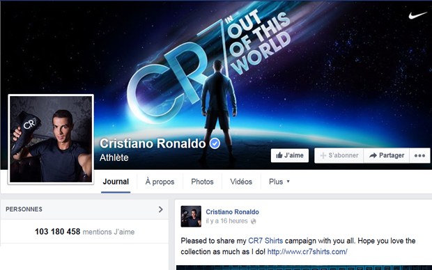 C’est le chiffre du jour, la valorisation d’un post facebook de Cristiano sur sa page est estimé à 120 000€.  Avec plus de 103 millions de fans sur sa fan page et un taux d’engagement intéressant, le cabinet de consulting Allemand Repucom place le joueur portugais loin devant Lionel Messi