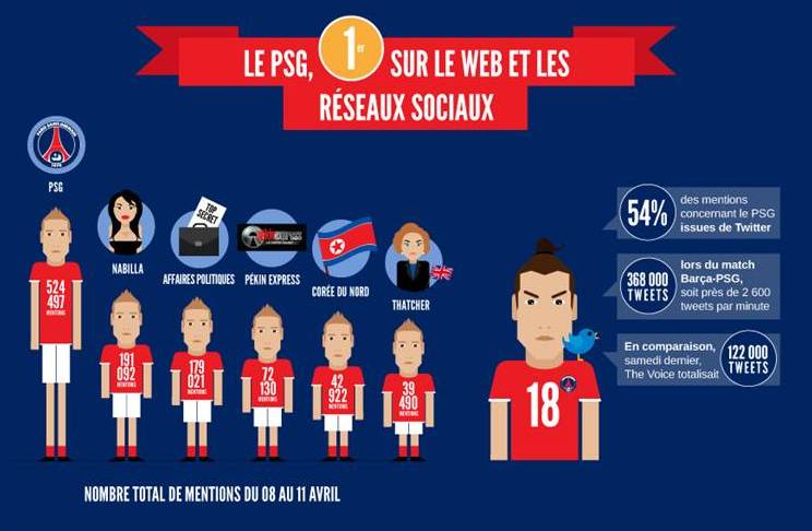 Premier sur les réseaux sociaux avec plus de 500 000 mentions devant Nabilla et compagnie, aux coudes à coudes sur les médias traditionnels (TV, radio et presse), le PSG est devenu aujourd’hui un véritable média qui fait parler de lui même quand il se passe pas grand chose même si la semaine dernière le club parisien était à 20 minutes d’éliminer le grand Barça. Et on parie ici que ce n’est pas fini, en route vers la Ligue 1, en phase de recruter d’autres grandes pointures, vous allez entendre parler du PSG de plus en plus souvent !